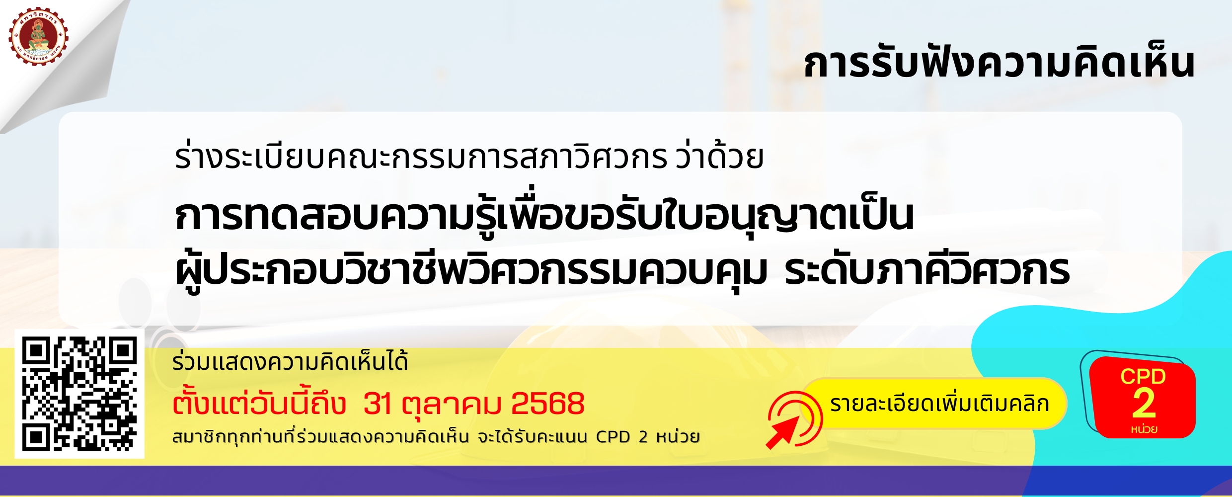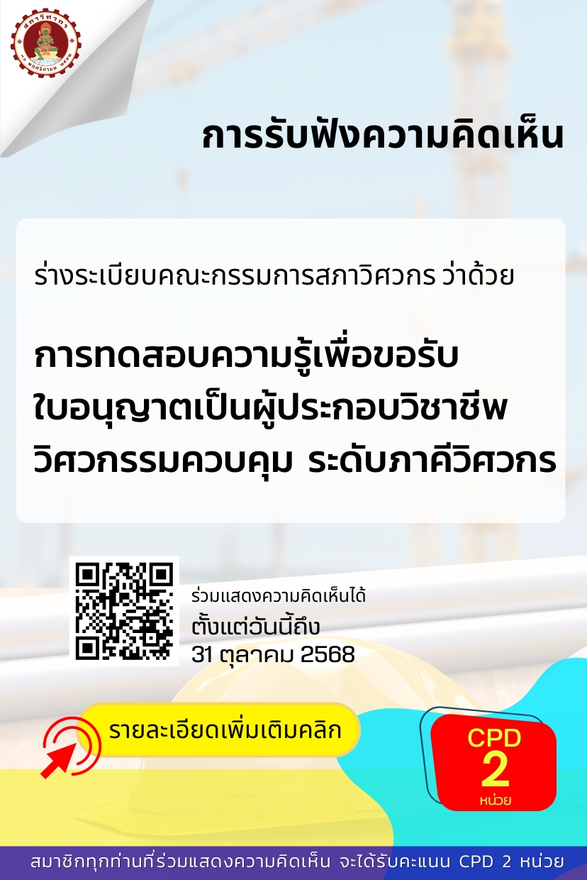 ขอเชิญร่วมแสดงความเห็น ร่างระเบียบคณะกรรมการสภาวิศวกร ว่าด้วยการทดสอบความรู้เพื่อขอรับใบอนุญาตเป็นผู้ประกอบวิชาชีพวิศวกรรมควบคุม ระดับภาคีวิศวกร (ฉบับที่ ..) พ.ศ. …. เพื่อ ➡️ เพิ่มเติมการอธิบายรายละเอียดเกี่ยวกับขอบเขตรายวิชาในหมวดวิชาพื้นฐานทางวิศวกรรม สำหรับการทดสอบความรู้ในระดับภาคีวิศวกร เพื่อให้สามารถระบุขอบเขตของเนื้อหาที่ใช้ในการออกข้อสอบในแต่ละรายวิชาได้อย่างชัดเจน อันจะเป็นประโยชน์ต่อผู้เข้าสอบและสถาบันอุดมศึกษาที่จัดการเรียนการสอนหลักสูตรวิศวกรรมศาสตร์ ในการเตรียมความพร้อมและวางแผนการเรียนการสอนให้สอดคล้องกับแนวทางการประเมินความรู้ดังกล่าว ท่านสามารถร่วมแสดงความคิดเห็นผ่าน Google From สภาวิศวกร ➡️➡️ โปรดคลิก 🎊ตั้งแต่บัดนี้เป็นต้นไป จนถึงวันที่ 31 ตุลาคม 2568🎊 เพื่อประโยชน์ที่สภาวิศวกรจะได้รับความคิดเห็นอันจะเป็นประโยชน์ต่อการพิจารณาในการออกร่างประกาศดังกล่าวได้อย่างเหมาะสมต่อไป หมายเหตุ : 1. สมาชิกที่เข้าร่วมแสดงความคิดเห็นจะได้รับ 2 CPD Units2. สามารถแสดงความคิดเห็นผ่านระบบกลางทางกฎหมายได้ที่ https://law.go.th/