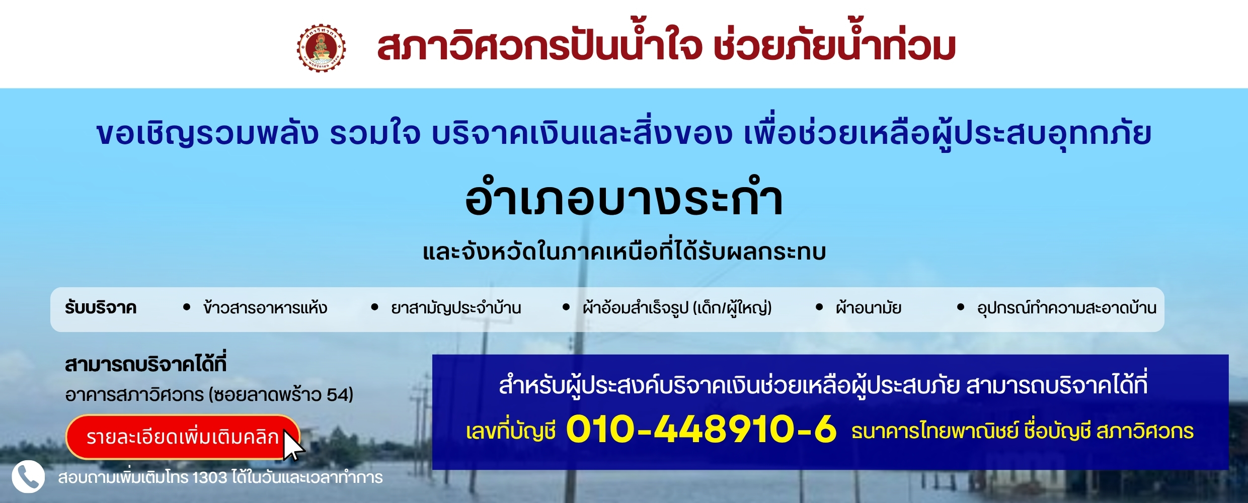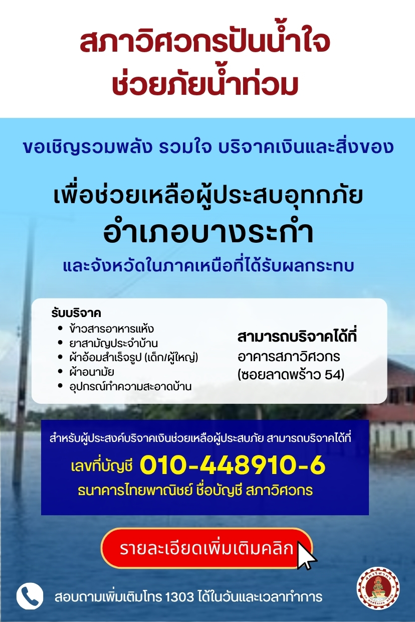 🔆สภาวิศวกรปันน้ำใจ ช่วยภัยน้ำท่วม 🔆 ขอเชิญรวมพลังรวมใจบริจาคเงินและสิ่งของเพื่อช่วยเหลือผู้ประสบอุทกภัย อ.บางระกำ และภาคเหนือที่ได้รับผลกระทบ 👕🩳 รับบริจาค 🧦🩴 🍚ข้าวสารอาหารแห้ง💊 ยาสามัญประจำบ้าน👶🏻 ผ้าอ้อมสำเร็จรูป (เด็ก/ผู้ใหญ่)♀️ ผ้าอนามัย🧹 อุปกรณ์ทำความสะอาดบ้าน สามารถบริจาคได้ที่ ➡️➡️ ➡️ อาคารสภาวิศวกร (ซอยลาดพร้าว 54) 💸💰💵 ผู้ประสงค์บริจาคเงินช่วยเหลือผู้ประสบภัย สามารถบริจาคได้ที่ ➡️เลขที่บัญชี 010-448910-6 ธนาคารไทยพาณิชย์ ชื่อบัญชี: สภาวิศวกร 📣ท่านใดต้องการใบเสร็จ สำหรับการร่วมบริจาค ในโครงการ”สภาวิศวกรปันน้ำใจ ช่วยภัยน้ำท่วม เพื่อช่วยเหลือผู้ประสบอุทกภัยภาคเหนือ” สามารถแจ้งชื่อที่อยู่ และนำส่งหลักฐานการโอนเงินมาที่ 🔆LINE ฝ่ายการคลังสภาวิศวกร คลิก >>> https://line.me/ti/p/z3YPTT4b8J หรือ🔆ส่ง email ถึงเจ้าหน้าที่การเงิน [email protected] 📞สอบถามเพิ่มเติมโทร 1303 ได้ในวันและเวลาทำการ