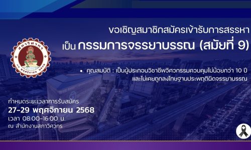 ขอเชิญสมาชิกสภาวิศวกรผู้มีคุณสมบัติตามมาตรา 53 วรรคสอง แห่งพระราชบัญญัติวิศวกร พ.ศ. 2542 (เป็นผู้ประกอบวิชาชีพวิศวกรรมควบคุมมาแล้วไม่น้อยกว่า 10 ปี และไม่เคยถูกลงโทษฐานประพฤติผิดจรรยาบรรณ) สมัครเข้ารับการสรรหาเพื่อแต่งตั้งเป็นกรรมการจรรยาบรรณ (สมัยที่ 9) จากสาขาวิศวกรรมควบคุม ดังนี้ สาขาวิศวกรรมโยธา จำนวน 7 คน สาขาวิศวกรรมเหมืองแร่ จำนวน 1 คน สาขาวิศวกรรมเครื่องกล จำนวน 2 คน สาขาวิศวกรรมไฟฟ้า จำนวน 2 คน สาขาวิศวกรรมอุตสาหการ จำนวน 1 คน สาขาวิศวกรรมสิ่งแวดล้อม จำนวน 1 คน สาขาวิศวกรรมเคมี จำนวน 1 คน กำหนดระยะเวลารับสมัครตั้งแต่วันที่ 27 พฤศจิกายน 2568 ถึงวันที่ 29 พฤศจิกายน 2568 ระหว่างเวลา 8.00 ถึง 16.00 […]