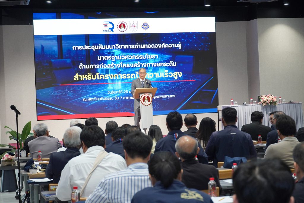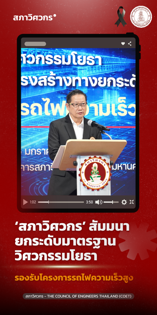 สภาวิศวกร จับมือกับ สทร. วสท. และกรมการขนส่งทางราง จัดการประชุมสัมมนาวิชาการถ่ายทอดองค์ความรู้เรื่อง มาตรฐานวิศวกรรมโยธาด้านการก่อสร้างทางยกระดับสำหรับโครงการรถไฟความเร็วสูง เมื่อวันจันทร์ที่ 26 มกราคม 2569 ณ ห้องวิศวภิวรรธน์ ชั้น 7 อาคารสภาวิศวกร โดยมีผู้แทนจากหน่วยงานภาครัฐ สถาบันวิชาชีพ นักวิชาการและวิศวกรเข้าร่วมอย่างคับคั่ง