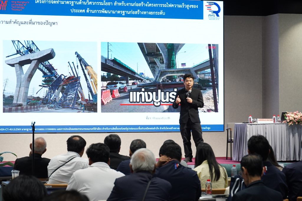 การประชุมได้รับเกียรติจาก นายกิตติพงษ์ วีระโพธิ์ประสิทธิ์ นายกสภาวิศวกร กล่าวต้อนรับผู้เข้าร่วมงานและเปิดการประชุมโดย รศ.ดร.โชติชัย เจริญงาม ประธานกรรมการ สทร. พร้อมรายงานวัตถุประสงค์การจัดงานโดย ดร.เพียงออ เลาหะวิไลย ผู้อำนวยการ สทร. ภายในงานมีการอภิปรายถึงแผนและนโยบายด้านการพัฒนามาตรฐานระบบรางของประเทศ รวมถึงการนำเสนอสาระสำคัญเกี่ยวกับมาตรฐานการขนส่งทางรางตามพระราชบัญญัติการขนส่งทางราง พ.ศ. 2568 เพื่อรองรับการก่อสร้างรถไฟความเร็วสูงในอนาคต โดยผู้แทนจากกรมการขนส่งทางรางและผู้เชี่ยวชาญด้านมาตรฐานระบบราง นอกจากนี้ ยังมีการอภิปรายกรณีศึกษาอุบัติเหตุเครนถล่ม เพื่อนำไปสู่การยกระดับมาตรฐานความปลอดภัยในการก่อสร้างและการประเมินสมรรถนะของแกนทรีลำเลียงสำหรับงานติดตั้งคานรูปกล่อง รวมถึงการบรรยายพิเศษเกี่ยวกับมาตรฐานการก่อสร้าง การตรวจสอบ และการทดสอบสมรรถนะของอุปกรณ์สำหรับโครงสร้างทางยกระดับในโครงการรถไฟความเร็วสูง
