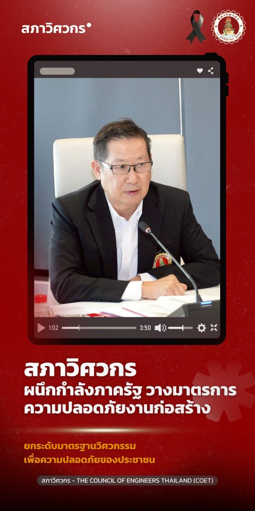 วันที่ 19 มกราคม 2569 – สภาวิศวกรเรียกประชุมด่วน ระดมความคิดเห็นจากหน่วยงานภาครัฐและองค์กรวิชาชีพชั้นนำ เพื่อกำหนดแนวทางการบริหารโครงการก่อสร้างในพื้นที่สาธารณะเพื่อแก้ไขปัญหาความปลอดภัยในงานก่อสร้างโครงสร้างพื้นฐานขนาดใหญ่ของประเทศ หลังเกิดเหตุเครนถล่มต่อเนื่องที่จังหวัดนครราชสีมาและถนนพระราม 2