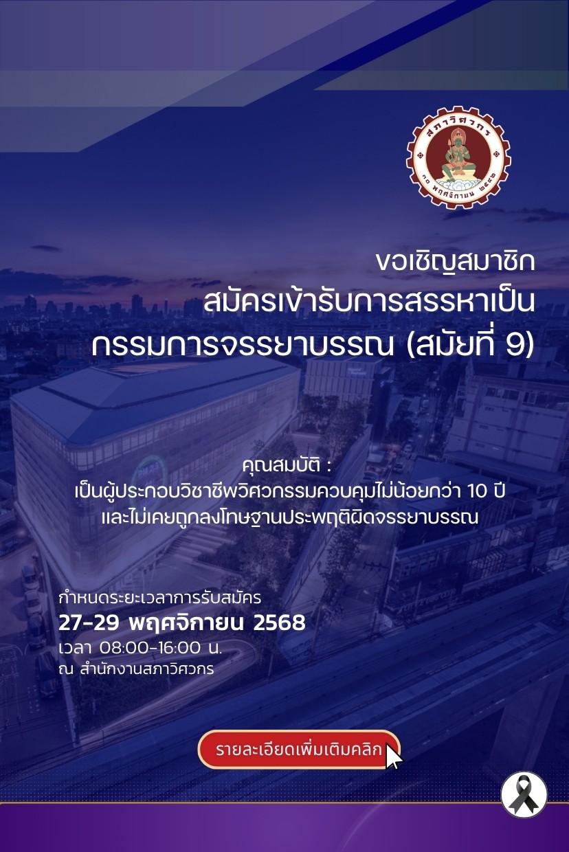 ขอเชิญสมาชิกสภาวิศวกรผู้มีคุณสมบัติตามมาตรา 53 วรรคสอง แห่งพระราชบัญญัติวิศวกร พ.ศ. 2542 (เป็นผู้ประกอบวิชาชีพวิศวกรรมควบคุมมาแล้วไม่น้อยกว่า 10 ปี และไม่เคยถูกลงโทษฐานประพฤติผิดจรรยาบรรณ) สมัครเข้ารับการสรรหาเพื่อแต่งตั้งเป็นกรรมการจรรยาบรรณ (สมัยที่ 9) จากสาขาวิศวกรรมควบคุม ดังนี้ สาขาวิศวกรรมโยธา จำนวน 7 คน สาขาวิศวกรรมเหมืองแร่ จำนวน 1 คน สาขาวิศวกรรมเครื่องกล จำนวน 2 คน สาขาวิศวกรรมไฟฟ้า จำนวน 2 คน สาขาวิศวกรรมอุตสาหการ จำนวน 1 คน สาขาวิศวกรรมสิ่งแวดล้อม จำนวน 1 คน สาขาวิศวกรรมเคมี จำนวน 1 คน กำหนดระยะเวลารับสมัครตั้งแต่วันที่ 27 พฤศจิกายน 2568 ถึงวันที่ 29 พฤศจิกายน 2568 ระหว่างเวลา 8.00 ถึง 16.00 […]