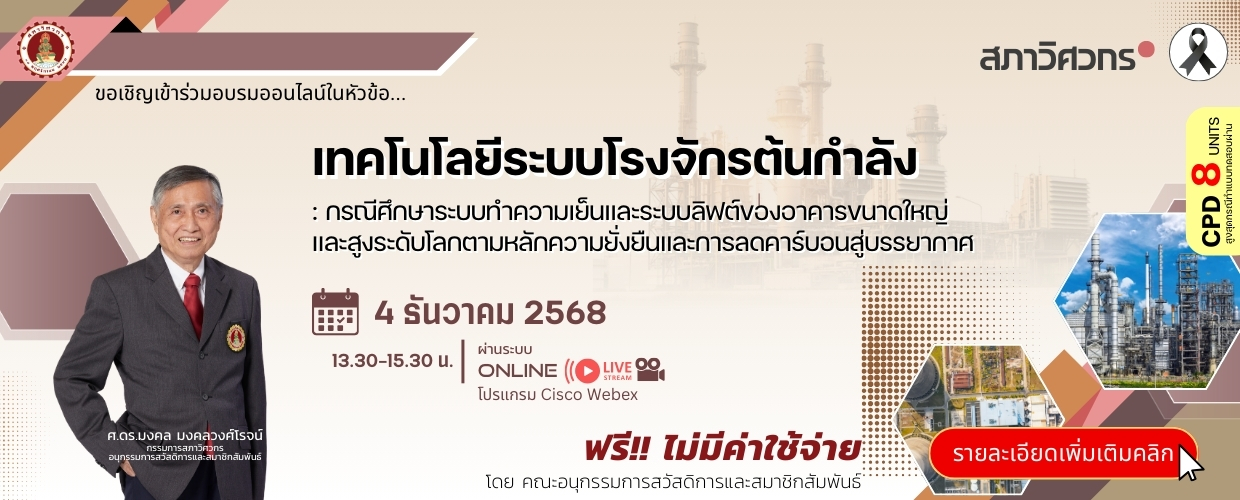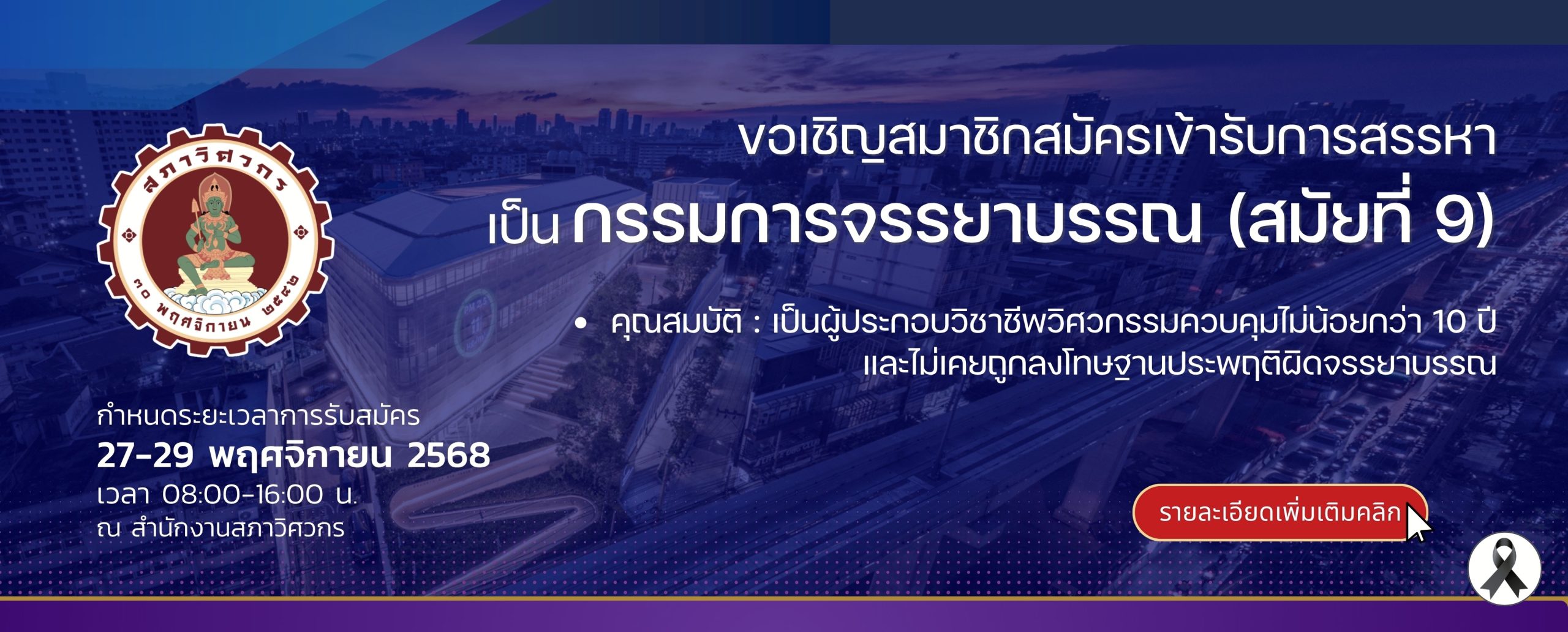 12 Nov 2025ขอเชิญสมาชิกสภาวิศวกรสมัครเข้ารับการสรรหา เพื่อเสนอชื่อต่อที่ประชุมใหญ่สภาวิศวกรเแต่งตั้งเป็นกรรมการจรรยาบรรณ (สมัยที่ 9)