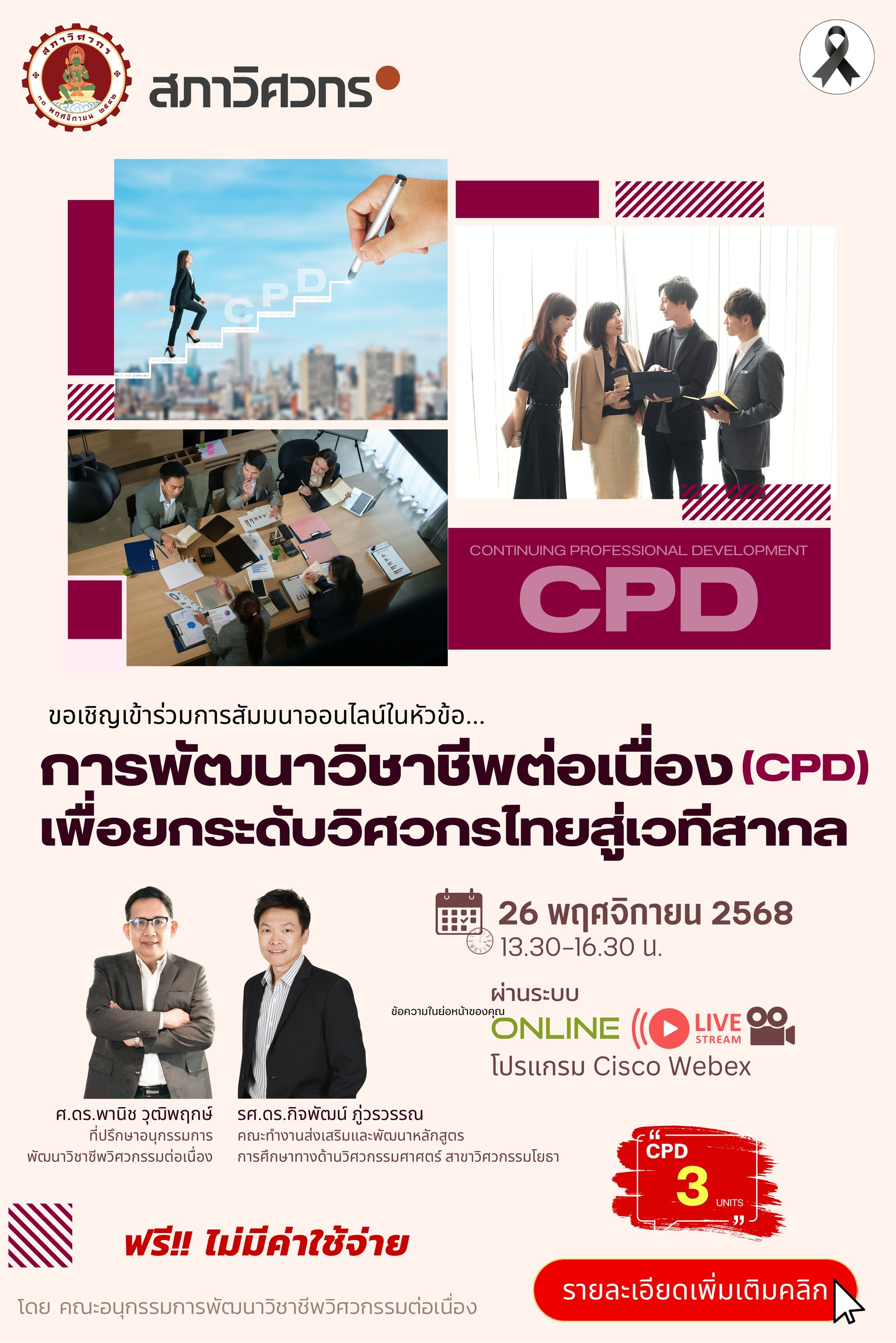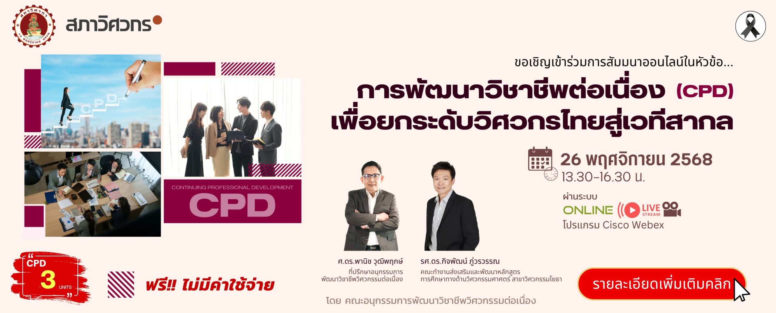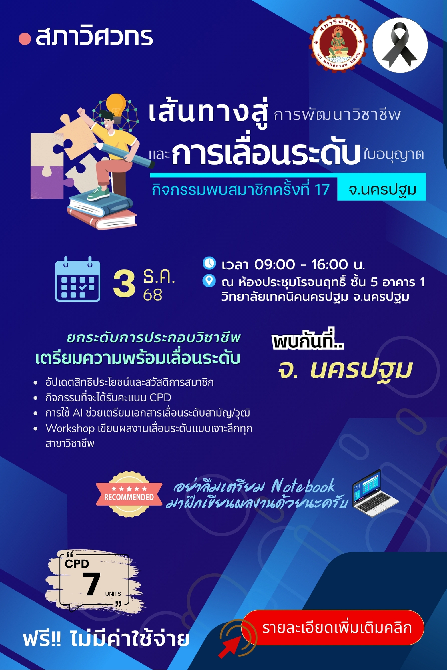 📣 เปิดลงทะเบียนแล้ว! เส้นทางสู่การพัฒนาวิชาชีพและการเลื่อนระดับใบอนุญาต จังหวัดนครปฐม (กิจกรรมพบสมาชิกครั้งที่ 17) 🎉เตรียมตัวให้พร้อม ก้าวสู่ความเป็นมืออาชีพ!🎉งานสัมมนาที่คุณไม่ควรพลาด! เหมาะสำหรับวิศวกรทุกระดับที่ต้องการ เลื่อนระดับใบอนุญาต, สะสม CPD Units, และ อัปเดตความรู้สายอาชีพ อย่างเข้มข้นและครบถ้วนในวันเดียว 📅 วันพุธที่ 3 ธันวาคม 2568⏰ 09.00 – 16.00 น.📍 ณ ห้องประชุมโรจนฤทธิ์ ชั้น 5 อาคาร 1 วิทยาลัยเทคนิคนครปฐม จังหวัดนครปฐม (Onsite เท่านั้น) ✅ เข้าร่วมฟรี! รับคะแนนหน่วยความรู้ จำนวน 7 CPD Units • การนำปัญญาประดิษฐ์ (AI) มาช่วยในการเตรียมเอกสารเพื่อเลื่อนระดับสามัญและวุฒิวิศวกร• เข้าร่วม Workshop เขียนผลงานเลื่อนระดับเชิงลึก : เรียนรู้เทคนิคการเขียนผลงานเพื่อเลื่อนระดับอย่างเข้มข้นลงลึกแต่ละสาขา (สมาชิกควรนำเครื่องคอมพิวเตอร์ และผลงานที่ท่านสะสมไว้มาขอคำแนะนำจากวิทยากรอย่างใกล้ชิด)• รับฟังการบรรยายกิจกรรม CPD มีอะไรบ้างแนะนำการ เข้าระบบเพื่อบันทึกคะแนน CPD ง่ายๆ ด้วยตัวท่านเอง• มารับทราบ […]