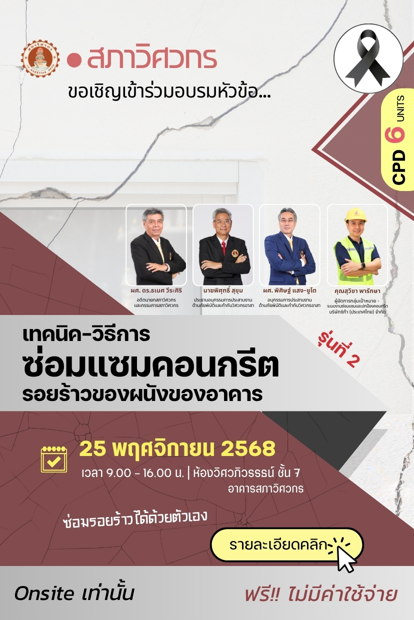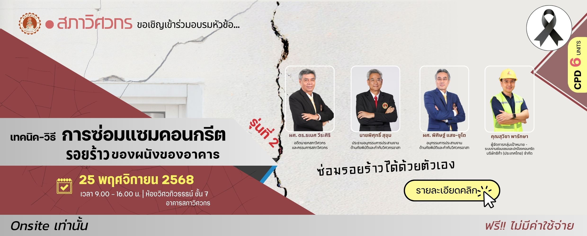 📣 เปิดลงทะเบียนแล้ว! เส้นทางสู่การพัฒนาวิชาชีพและการเลื่อนระดับใบอนุญาต จังหวัดสระบุรี (กิจกรรมพบสมาชิกครั้งที่ 16) 🎉เตรียมตัวให้พร้อม ก้าวสู่ความเป็นมืออาชีพ!🎉งานสัมมนาที่คุณไม่ควรพลาด! เหมาะสำหรับวิศวกรทุกระดับที่ต้องการ เลื่อนระดับใบอนุญาต, สะสม CPD Units, และ อัปเดตความรู้สายอาชีพ อย่างเข้มข้นและครบถ้วนในวันเดียว 📅 วันเสาร์ที่ 22 พฤศจิกายน 2568⏰ 09.00 – 16.00 น.📍 ณ ห้องประชุมอาคารรวมใจ ชั้น 1 วิทยาลัยเทคนิคสระบุรี จังหวัดสระบุรี (เท่านั้น) ✅ เข้าร่วมฟรี! รับคะแนนหน่วยความรู้ จำนวน 7 CPD Units • การนำปัญญาประดิษฐ์ (AI) มาช่วยในการเตรียมเอกสารเพื่อเลื่อนระดับสามัญและวุฒิวิศวกร• เข้าร่วม Workshop เขียนผลงานเลื่อนระดับเชิงลึก : เรียนรู้เทคนิคการเขียนผลงานเพื่อเลื่อนระดับอย่างเข้มข้นลงลึกแต่ละสาขา (สมาชิกควรนำเครื่องคอมพิวเตอร์ และผลงานที่ท่านสะสมไว้มาขอคำแนะนำจากวิทยากรอย่างใกล้ชิด)• รับฟังการบรรยายกิจกรรม CPD มีอะไรบ้างแนะนำการ เข้าระบบเพื่อบันทึกคะแนน CPD ง่ายๆ ด้วยตัวท่านเอง• มารับทราบ Update สวัสดิการที่ท่านได้รับและสิทธิหน้าที่ที่ท่านพึงมีต่อสภาวิศวกร วันงานขอให้ผู้เข้าร่วมงานดำเนินการ […]
