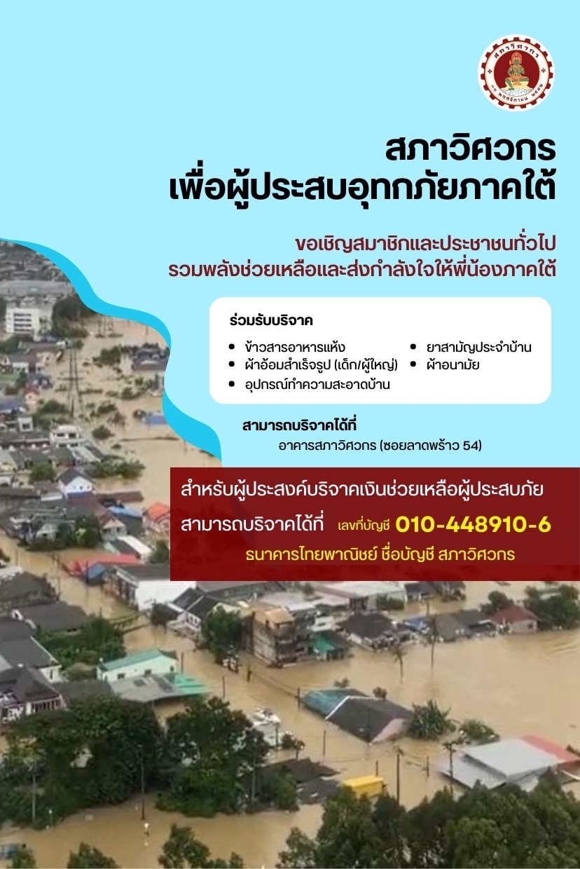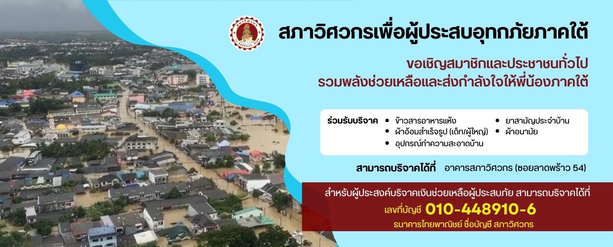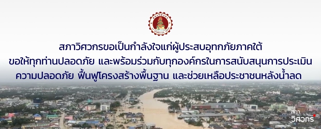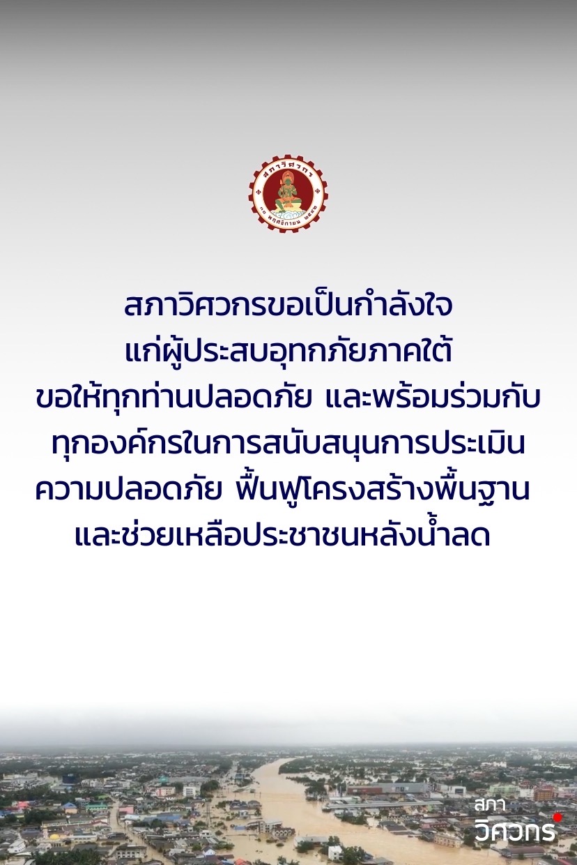 สภาวิศวกรขอแสดงความเสียใจอย่างยิ่งต่อครอบครัวผู้เสียชีวิต รวมถึงผู้ที่ได้รับผลกระทบจากเหตุอุทกภัยในครั้งนี้ ซึ่งสร้างความสูญเสียต่อชีวิต ทรัพย์สิน และความเป็นอยู่ของประชาชนจำนวนมาก ขอเป็นกำลังใจให้ทุกท่านมีพลังใจเข้มแข็ง และสามารถก้าวผ่านช่วงเวลาที่ยากลำบากนี้ไปได้โดยเร็ว สภาวิศวกรขอชื่นชมเจ้าหน้าที่ ผู้ปฏิบัติงานภาคสนาม อาสาสมัคร และพี่น้องประชาชนทุกพื้นที่ ที่ร่วมกันช่วยเหลือผู้ประสบภัยอย่างเต็มกำลัง แสดงถึงพลังความร่วมมืออันเข้มแข็งของคนไทยในยามวิกฤต สภาวิศวกรพร้อมร่วมมือกับภาครัฐ ภาคเอกชน และสมาคมวิชาชีพที่เกี่ยวข้อง ในการสนับสนุนการประเมินความปลอดภัย ฟื้นฟูโครงสร้างพื้นฐาน และช่วยเหลือประชาชนหลังน้ำลด เพื่อให้ทุกชุมชนกลับมาฟื้นตัวได้อย่างมั่นคงอีกครั้ง ขอให้ทุกท่านปลอดภัย และหวังว่าสถานการณ์จะคลี่คลายโดยเร็วที่สุดสภาวิศวกรขอเป็นกำลังใจให้พี่น้องชาวภาคใต้ทุกคน