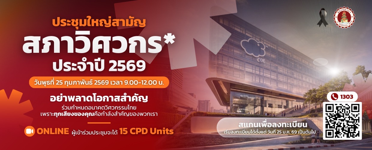 ขอเรียนเชิญสมาชิกสภาวิศวกรเข้าร่วมการประชุมใหญ่สามัญสภาวิศวกร ประจำปี 2569 ในวันที่ 25 กุมภาพันธ์ 2569 เวลา 09.00-12.00 น. ด้วยวิธีการประชุมผ่านสื่ออิเล็กทรอนิกส์ ตามพระราชกำหนดว่าด้วยการประชุมผ่านสื่ออิเล็กทรอนิกส์ พ.ศ. 2563 โดยสามารถลงทะเบียนเข้าร่วมประชุมได้ตั้งแต่วันที่ 25 มกราคม 2569 เป็นต้นไป (ระบบการประชุมรองรับผู้เข้าร่วมประชุมจำนวน 10,000 คน และติดตามรับชมการถ่ายทอดสดการประชุมใหญ่ฯ ผ่านช่องทางที่สภาวิศวกรกำหนด) โดยท่านสามารถลงทะเบียนล่วงหน้าเพิ่มความสะดวกรวดเร็วในการประชุม ปิดลงทะเบียนล่วงหน้าวันที่ 24 กุมภาพันธ์ 2569 เวลา 15.00 น. ทั้งนี้ ท่านสามารถลงทะเบียนได้ตลอดระยะเวลาการประชุม สมาชิกสามารถศึกษาคู่มือการลงทะเบียนเข้าร่วมประชุมใหญ่สามัญสภาวิศวกร ประจำปี 2569 การติดตั้งและการใช้งานโปรแกรมการประชุมผ่านสื่ออิเล็กทรอนิกส์ได้ทางเว็บไซต์สภาวิศวกร www.coe.or.th