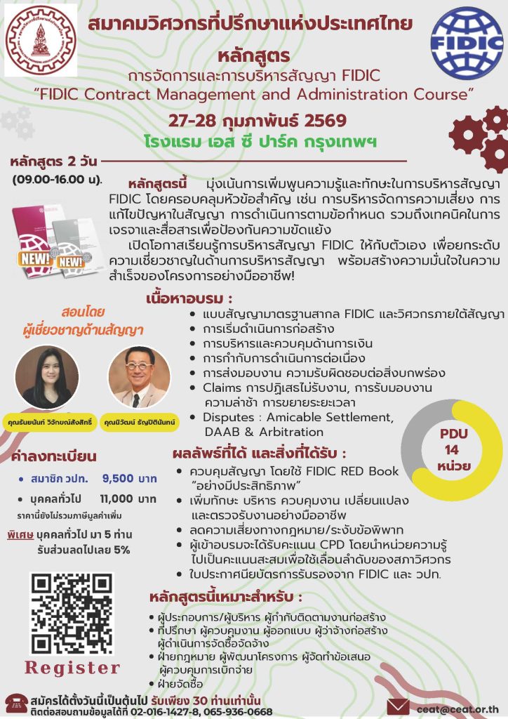 สมาคมวิศวกรที่ปรึกษาแห่งประเทศไทย ขอเชิญเข้าร่วมหลักสูตรการจัดการและการบริหารสัญญา FIDIC “FIDIC Contract Management and Administration Course”