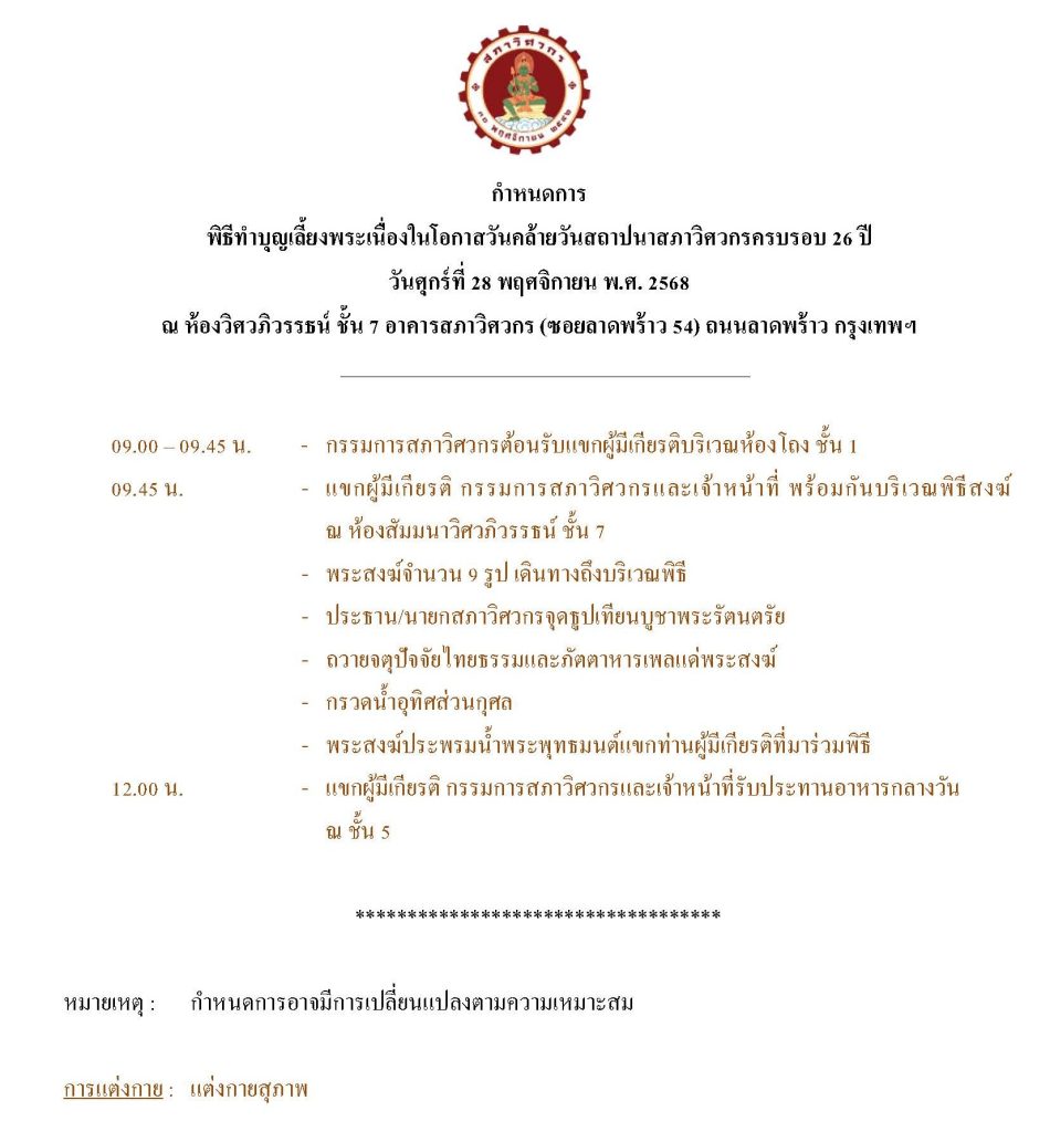 สภาวิศวกรกำหนดจัดพิธีทำบุญเลี้ยงพระ เนื่องในโอกาสวันคล้ายวันสถาปนาสภาวิศวกร ครบรอบ 26 ปี เพื่อความเป็นสิริมงคลและส่งเสริมกิจกรรมอันเป็นประเพณีอันดีงามขององค์กร โดยขอเชิญสมาชิกสภาวิศวกรเข้าร่วมเป็นส่วนหนึ่งในพิธีดังกล่าว
