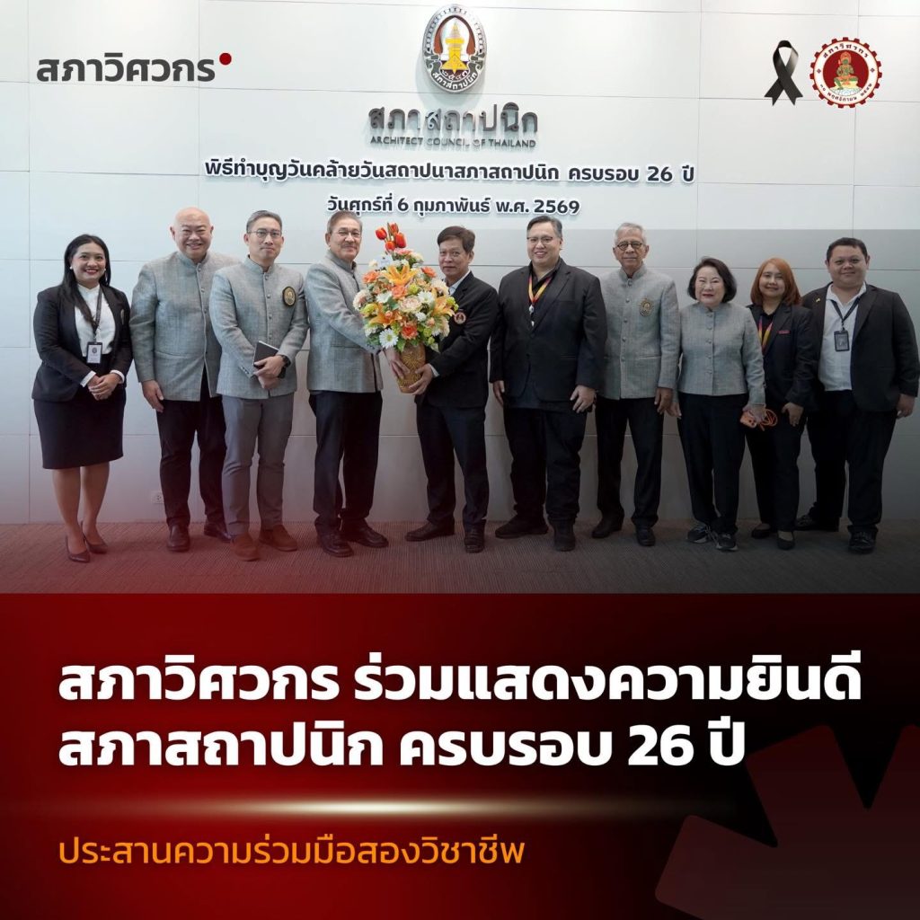 เมื่อวันที่ 6 กุมภาพันธ์ 2569 นายประสงค์ นรจิตร์ เหรัญญิกสภาวิศวกร ได้เป็นผู้แทนสภาวิศวกร เข้าร่วมแสดงความยินดีกับสภาสถาปนิก เนื่องในโอกาสครบรอบวันสถาปนาสภาสถาปนิก ครบรอบ 26 ปี ณ สภาสถาปนิก เพื่อร่วมแสดงความยินดีในวาระสำคัญและสะท้อนถึงความสัมพันธ์อันแน่นแฟ้นระหว่างองค์กรวิชาชีพด้านวิศวกรรมและสถาปัตยกรรมของประเทศ