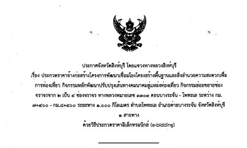 ประกาศจังหวัดสิงห์บุรี โดยแขวงทางหลวงสิงห์บุรี เรื่อง ประกวดราคาจ้างก่อสร้างโครงการพัฒนาเชื่อมโยงโครงสร้างพื้นฐานและสิ่งอำนวยความสะดวกเพื่อการท่องเที่ยว กิจกรรมหลักพัฒนาปรับปรุงเส้นทางคมนาคมสู่แหล่งท่องเที่ยว กิจกรรมย่อยขยายช่องจราจรจาก 2 เป็น 4 ช่องจราจร ทางหลวงหมายเลข 3303 ตอนบางระจัน – โพทะเล ระหว่าง กม.7+400 – กม.8+400 ระยะทาง 1,000 กิโลเมตร ตำบลโพทะเล อำเภอค่ายบางระจัน จังหวัดสิงห์บุรี 1 สายทาง ด้วยวิธีประกวดราคาอิเล็กทรอนิกส์ (e-bidding)