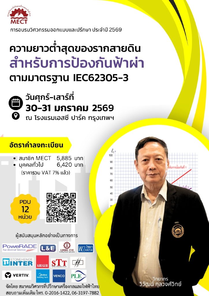 สมาคมวิศวกรที่ปรึกษาเครื่องกลและไฟฟ้าไทย ขอเชิญเข้าร่วมหลักสูตรความยาวต่ำสุดของรากสายดินสำหรับการป้องกันฟ้าผ่าตามมาตรฐาน IEC 62305-3
