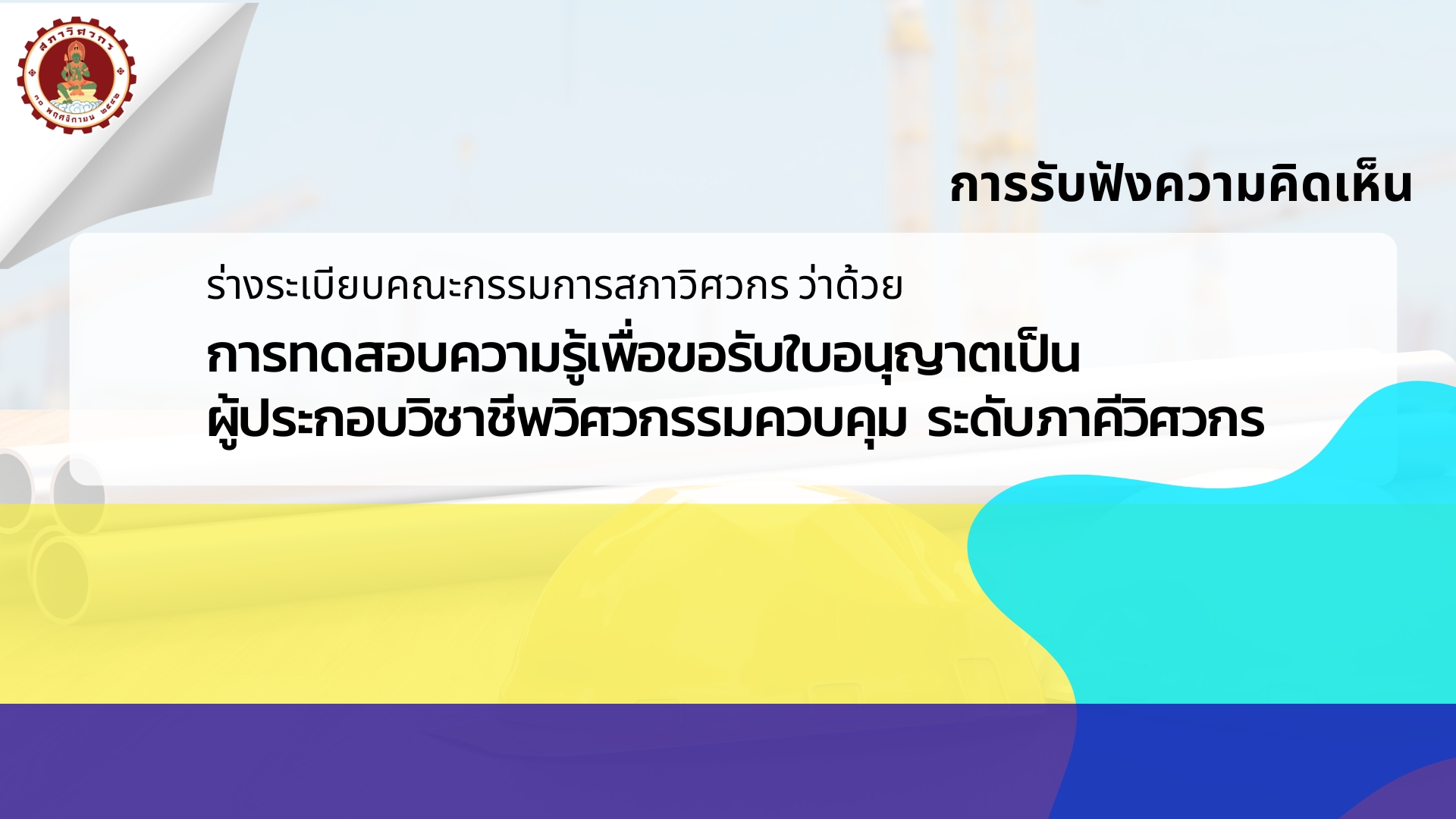 ขอเชิญร่วมแสดงความคิดเห็นร่างระเบียบคณะกรรมการสภาวิศวกร ว่าด้วยการทดสอบความรู้เพื่อขอรับใบอนุญาตเป็นผู้ประกอบวิชาชีพวิศวกรรมควบคุม ระดับภาคีวิศวกร (ฉบับที่ ..) พ.ศ. ….