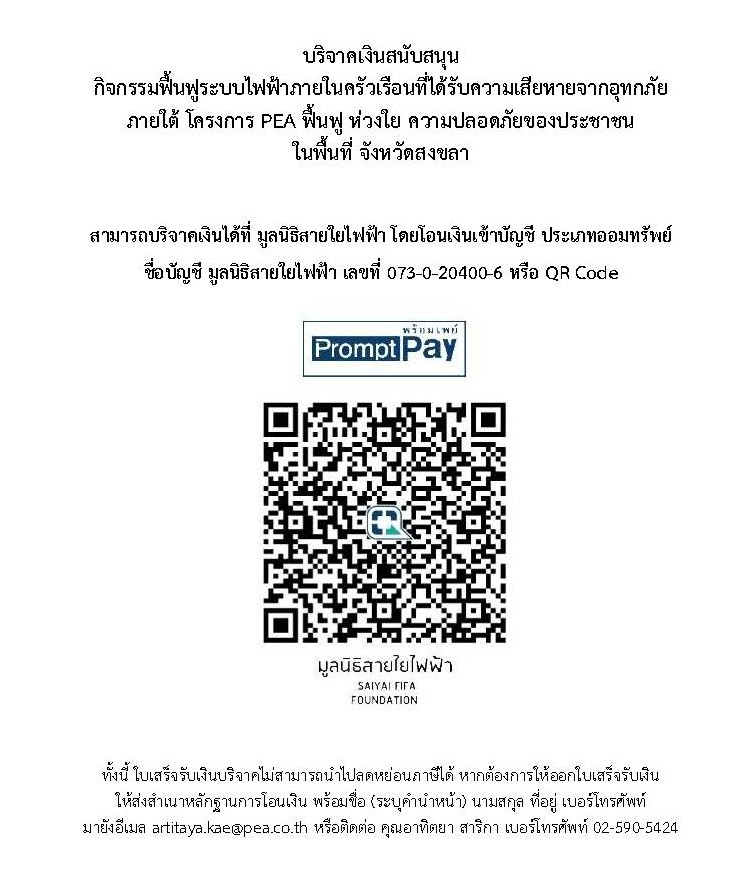 การไฟฟ้าส่วนภูมิภาค (PEA) จึงจัดโครงการ “PEA ฟื้นฟู ห่วงใย ความปลอดภัยของประชาชน” เพื่อช่วยฟื้นฟูและซ่อมแซมระบบไฟฟ้าให้กลับมาใช้งานได้อย่างปลอดภัย พร้อมเชิญชวนหน่วยงานภาครัฐ ภาคเอกชน และประชาชนผู้มีจิตศรัทธา ร่วมสนับสนุนใน 3 ด้าน ดังนี้