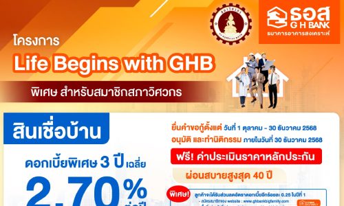 ธนาคารอาคารสงเคราะห์ ขอประชาสัมพันธ์ผลิตภัณฑ์สินเชื่อดอกเบี้ยต่ำและเงินฝากดอกเบี้ยสูง โครงการ Life Begins with GHB ปี 2568 สำหรับสมาชิกสภาวิศวกร