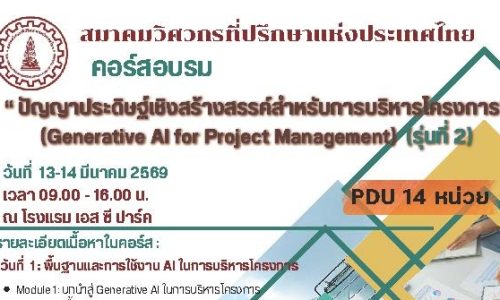 21 Jan 2026สมาคมวิศวกรที่ปรึกษาแห่งประเทศไทย ขอเชิญเข้าร่วมหลักสูตร : ปัญญาประดิษฐ์เชิงสร้างสรรค์สำหรับการบริหารโครงการ (Generative AI for Project Management) รุ่นที่ 2