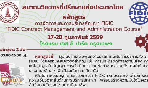 21 Jan 2026สมาคมวิศวกรที่ปรึกษาแห่งประเทศไทย ขอเชิญเข้าร่วมหลักสูตรการจัดการและการบริหารสัญญา FIDIC “FIDIC Contract Management and Administration Course”