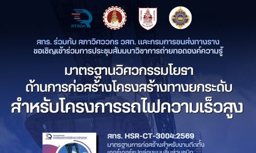 ขอเชิญประชุมสัมมนาวิชาการ | หัวข้อ “มาตรฐานวิศวกรรมโยธา ด้านการก่อสร้างโครงสร้างทางยกระดับ สำหรับโครงการรถไฟความเร็วสูง ”