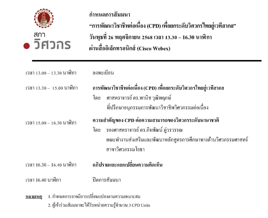 สภาวิศวกรโดยคณะอนุกรรมการพัฒนาวิชาชีพวิศวกรรมต่อเนื่องขอเรียนเชิญเข้าร่วมสัมมนา เรื่อง “การพัฒนาวิชาชีพต่อเนื่อง (CPD) เพื่อยกระดับวิศวกรไทยสู่เวทีสากล”