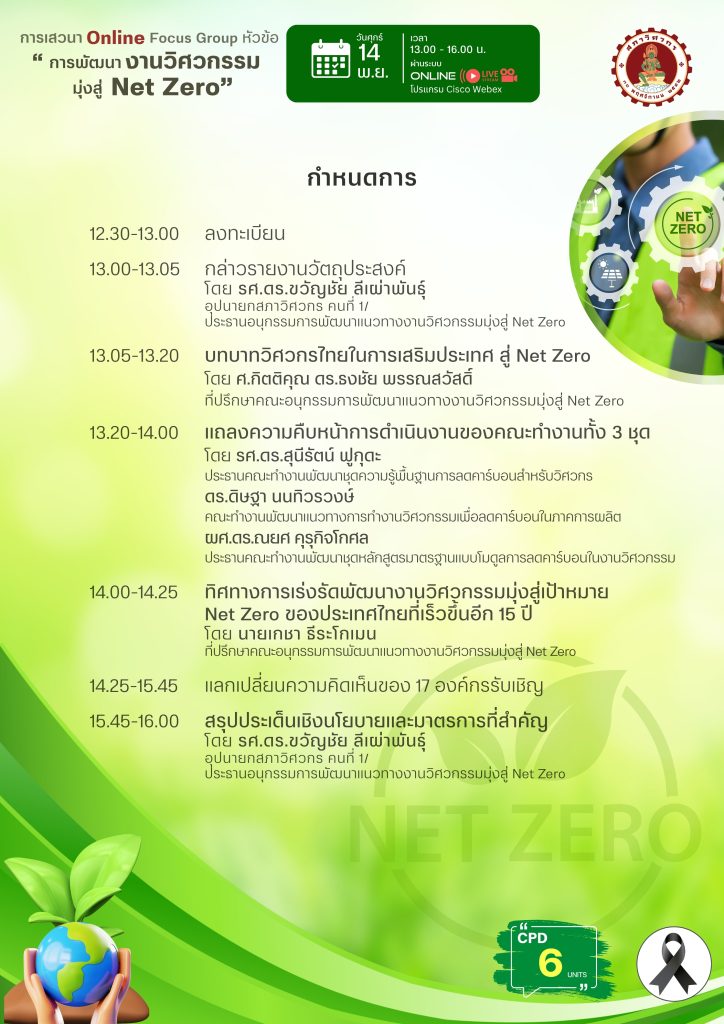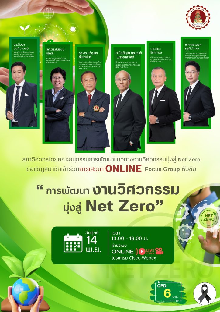 สภาวิศวกรโดยคณะอนุกรรมการพัฒนาแนวทางงานวิศวกรรมมุ่งสู่ Net Zero ขอเรียนเชิญเข้าร่วมเสวนา ONLINE Focus Group หัวข้อ “การพัฒนางานวิศวกรรมมุ่งสู่ Net Zero”