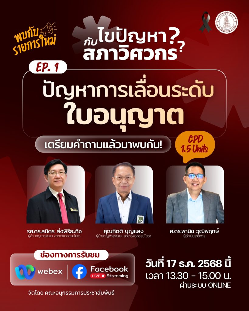 จะนำเสนอข้อมูล ความรู้ และแนวทางเกี่ยวกับ ปัญหาการเลื่อนระดับใบอนุญาตประกอบวิชาชีพวิศวกรรม เพื่อเสริมสร้างความเข้าใจเกี่ยวการเลื่อนระดับใบอนุญาตอย่างถูกต้องและตอบข้อสงสัยของผู้ประกอบวิชาชีพโดยตรง