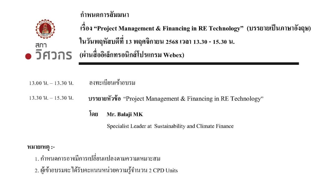 สภาวิศวกรโดยคณะอนุกรรมการสวัสดิการและสมาชิกสัมพันธ์ขอเรียนเชิญเข้าร่วมสัมมนา เรื่อง “Project Management & Financing in RE Technology”
