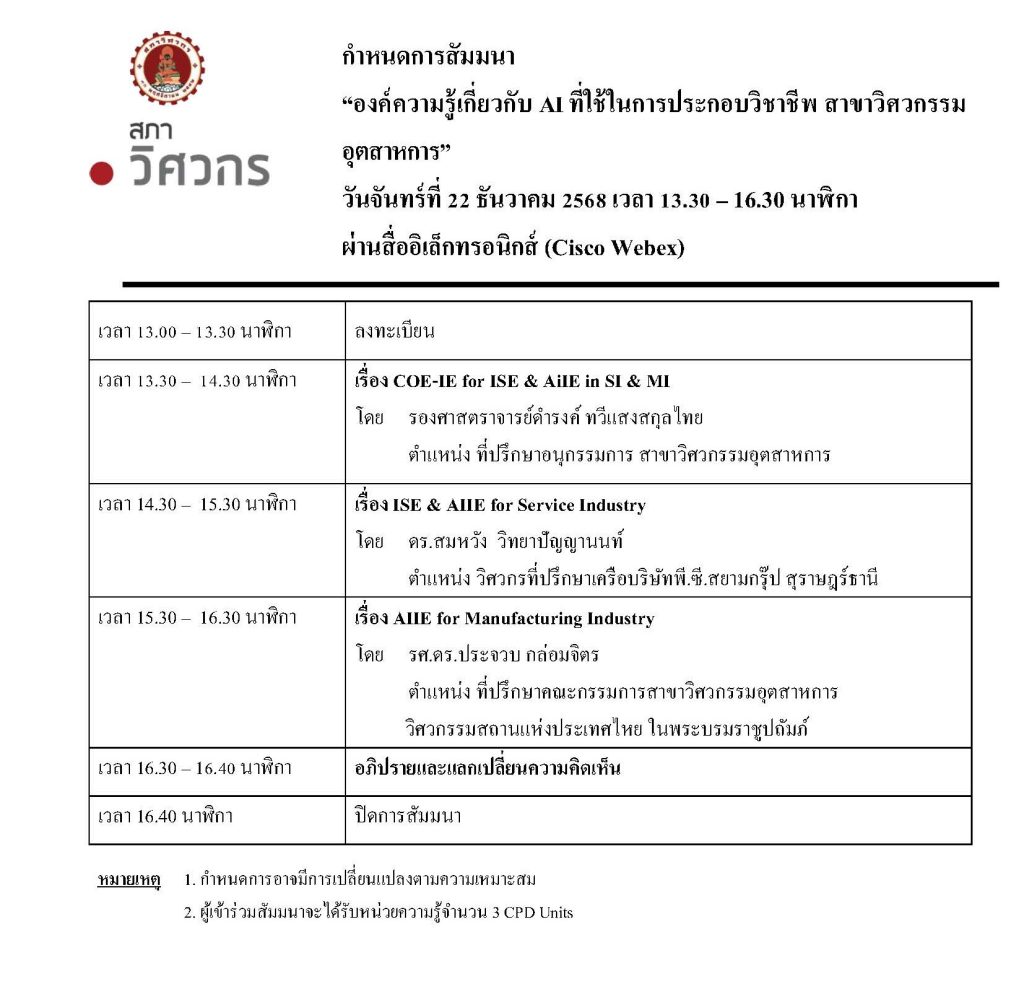 สภาวิศวกรโดยคณะอนุกรรมการ สาขาวิศวกรรมอุตสาหการขอเรียนเชิญเข้าร่วมสัมมนา เรื่อง “องค์ความรู้เกี่ยวกับ AI ที่ใช้ในการประกอบวิชาชีพ สาขาวิศวกรรมอุตสาหการ”