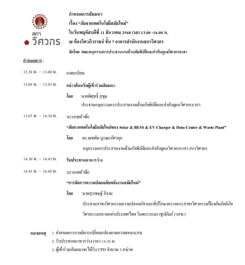 สภาวิศวกรโดยคณะอนุกรรมการประสานงานด้านภัยพิบัติและกำกับดูแลวิศวกรอาสา ขอเรียนเชิญเข้าร่วมสัมมนา เรื่อง “ภัยจากเทคโนโลยีสมัยใหม่”