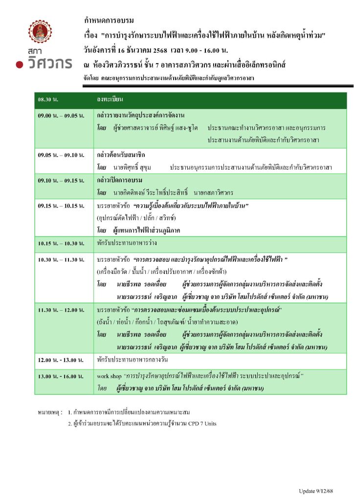 สภาวิศวกรโดยคณะอนุกรรมการประสานงานด้านภัยพิบัติและกำกับดูแลวิศวกรอาสาขอเรียนเชิญวิศวกรอาสาและสมาชิกเข้าร่วมอบรม เรื่อง “การบำรุงรักษาระบบไฟฟ้าและเครื่องใช้ไฟฟ้าภายในบ้าน หลังเกิดเหตุน้ำท่วม”
