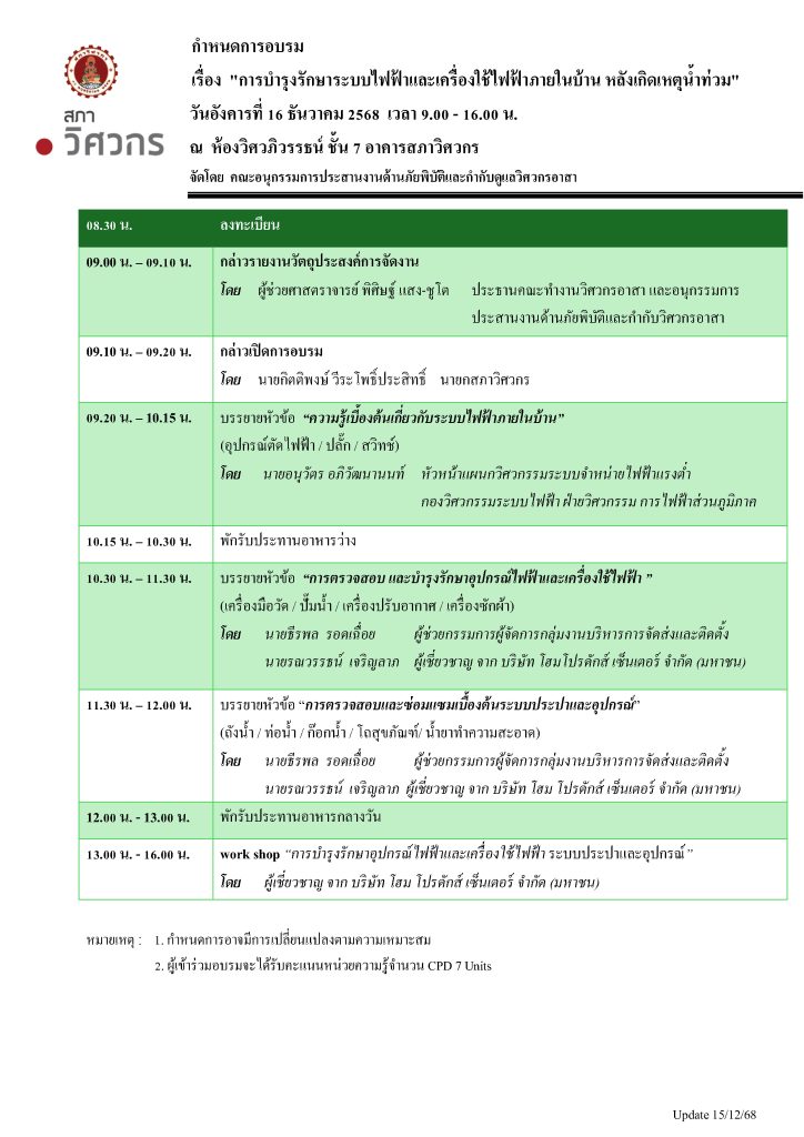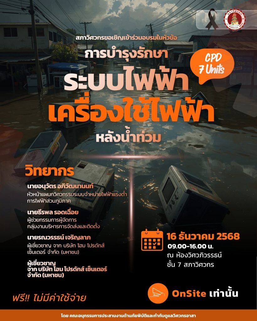 สภาวิศวกรโดยคณะอนุกรรมการประสานงานด้านภัยพิบัติและกำกับดูแลวิศวกรอาสาขอเรียนเชิญวิศวกรอาสาและสมาชิกเข้าร่วมอบรม เรื่อง “การบำรุงรักษาระบบไฟฟ้าและเครื่องใช้ไฟฟ้าภายในบ้าน หลังเกิดเหตุน้ำท่วม”
