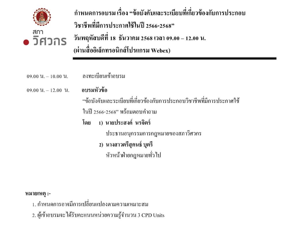 สภาวิศวกรโดยคณะอนุกรรมการกฎหมายของสภาวิศวกร ขอเรียนเชิญเข้าร่วมอบรม เรื่อง “ข้อบังคับและระเบียบที่เกี่ยวข้องกับการประกอบวิชาชีพที่มีการประกาศใช้ในปี 2566-2568”