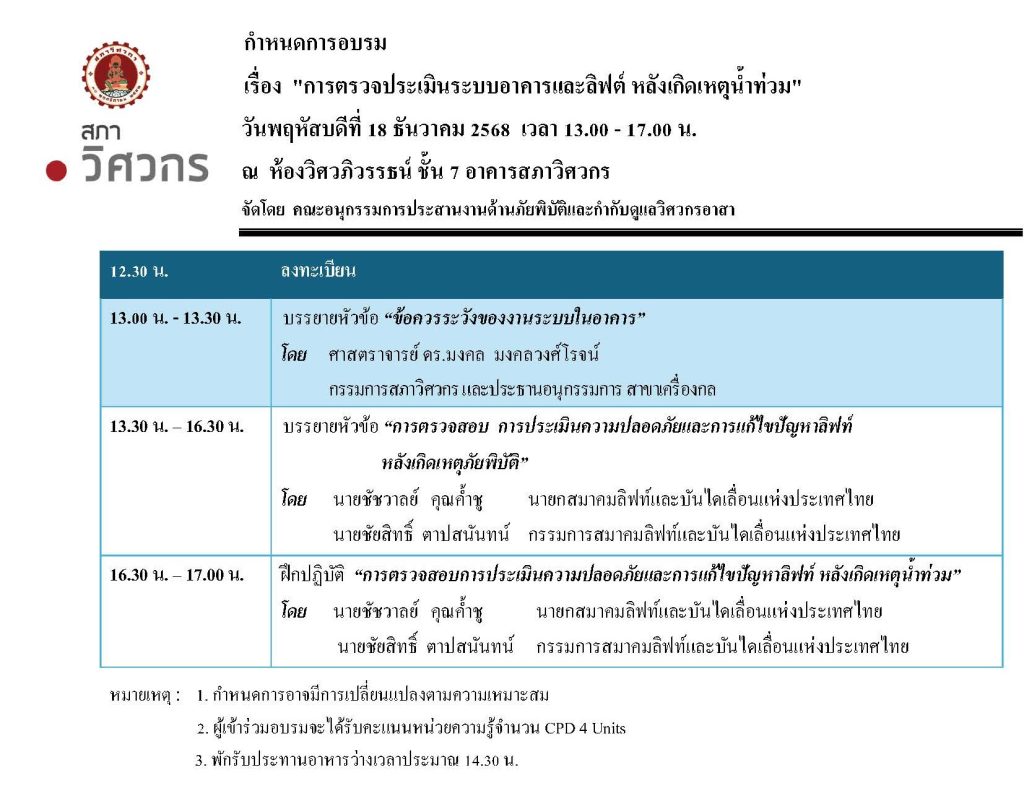สภาวิศวกรโดยคณะอนุกรรมการประสานงานด้านภัยพิบัติและกำกับดูแลวิศวกรอาสาขอเรียนเชิญวิศวกรอาสาและสมาชิกเข้าร่วมอบรม เรื่อง “การตรวจประเมินระบบอาคารและลิฟต์ หลังเกิดเหตุน้ำท่วม”