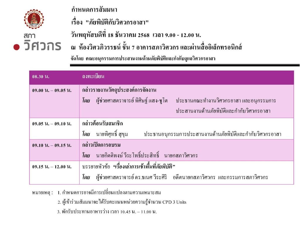 สภาวิศวกรโดยคณะอนุกรรมการประสานงานด้านภัยพิบัติและกำกับดูแลวิศวกรอาสาขอเรียนเชิญวิศวกรอาสาและสมาชิกเข้าร่วมสัมมนา เรื่อง “ภัยพิบัติกับวิศวกรอาสา”