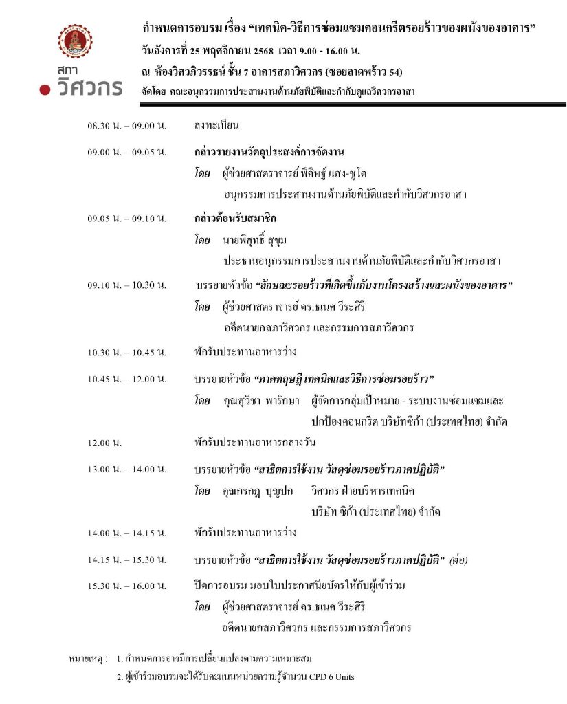 สภาวิศวกรโดยคณะอนุกรรมการประสานงานด้านภัยพิบัติและกำกับดูแลวิศวกรอาสา ขอเรียนเชิญเข้าร่วมอบรม เรื่อง “เทคนิค-วิธีการซ่อมแซมคอนกรีตรอยร้าวของผนังของอาคาร”