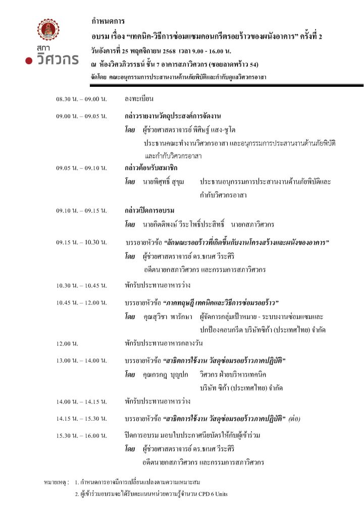 สภาวิศวกรโดยคณะอนุกรรมการประสานงานด้านภัยพิบัติและกำกับดูแลวิศวกรอาสา ขอเรียนเชิญเข้าร่วมอบรม เรื่อง “เทคนิค-วิธีการซ่อมแซมคอนกรีตรอยร้าวของผนังของอาคาร”