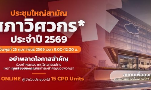 ขอเรียนเชิญสมาชิกสภาวิศวกรเข้าร่วมการประชุมใหญ่สามัญสภาวิศวกร ประจำปี 2569 ในวันที่ 25 กุมภาพันธ์ 2569 เวลา 09.00-12.00 น. ด้วยวิธีการประชุมผ่านสื่ออิเล็กทรอนิกส์ ตามพระราชกำหนดว่าด้วยการประชุมผ่านสื่ออิเล็กทรอนิกส์ พ.ศ. 2563 โดยสามารถลงทะเบียนเข้าร่วมประชุมได้ตั้งแต่วันที่ 25 มกราคม 2569 เป็นต้นไป (ระบบการประชุมรองรับผู้เข้าร่วมประชุมจำนวน 10,000 คน และติดตามรับชมการถ่ายทอดสดการประชุมใหญ่ฯ ผ่านช่องทางที่สภาวิศวกรกำหนด) โดยท่านสามารถลงทะเบียนล่วงหน้าเพิ่มความสะดวกรวดเร็วในการประชุม ปิดลงทะเบียนล่วงหน้าวันที่ 24 กุมภาพันธ์ 2569 เวลา 15.00 น. ทั้งนี้ ท่านสามารถลงทะเบียนได้ตลอดระยะเวลาการประชุม สมาชิกสามารถศึกษาคู่มือการลงทะเบียนเข้าร่วมประชุมใหญ่สามัญสภาวิศวกร ประจำปี 2569 การติดตั้งและการใช้งานโปรแกรมการประชุมผ่านสื่ออิเล็กทรอนิกส์ได้ทางเว็บไซต์สภาวิศวกร www.coe.or.th อนึ่ง สมาชิกสามารถดาวน์โหลดเอกสารประกอบการประชุมและเอกสารอื่น ๆ ที่เกี่ยวข้องได้ที่ www.coe.or.th ได้ตั้งแต่วันที่ 10 กุมภาพันธ์ 2569 หรือสอบถามเพิ่มเติมที่ สายด่วน 1303 ลงทะเบียน Scan QR Code หรือ หมายเหตุ ในการประชุมครั้งนี้ประธานที่ประชุมกำหนดวิธีนับเสียงลงมติทุกวาระการประชุม หรือในการขอความเห็นชอบต่าง ๆ ดังนี้ 1. จำนวนสมาชิกที่ลงคะแนน เห็นด้วย = A2. จำนวนสมาชิกที่ลงคะแนน ไม่เห็นด้วย = B3. จำนวนผู้ที่ลงคะแนน งดออกเสียง = C4. […]
